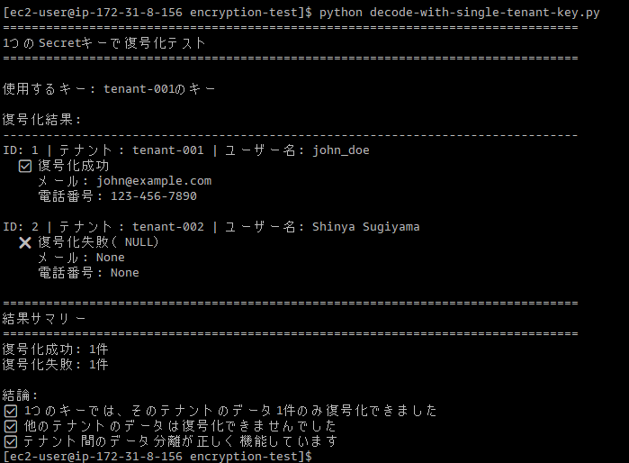 print("✅ 1つのキーでは、そのテナントのデータ1件のみ復号化できました")