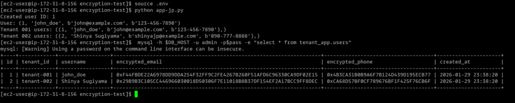 ここでは、データをINSERT時にそれぞれのテナントキーで暗号化して、暗号化されているか確認しています。